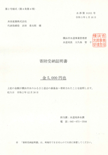 【寄付受納証明書】2020年12月30日 横浜市水のふるさと「道志の森基金」に 賛同し寄付しました。